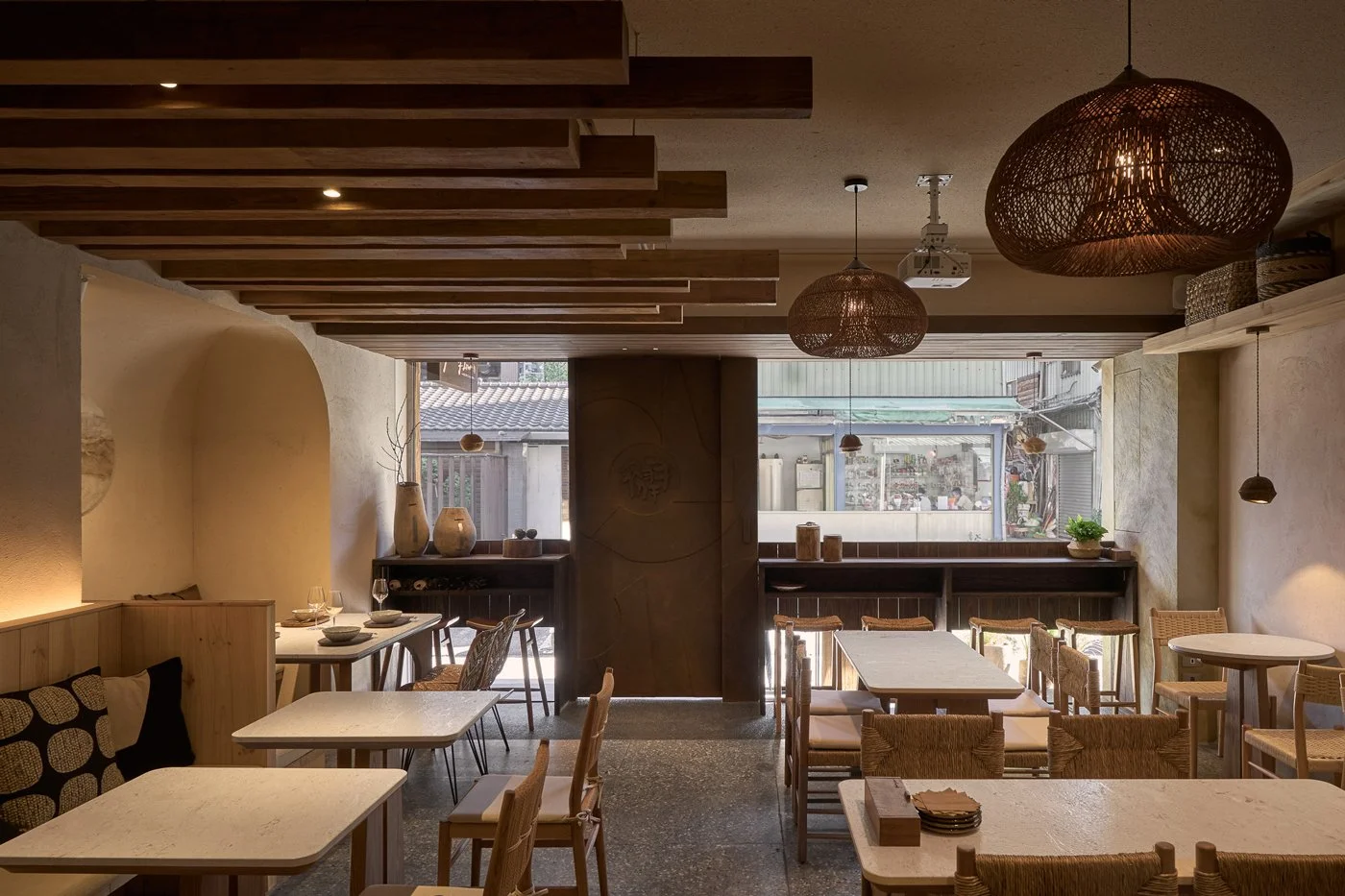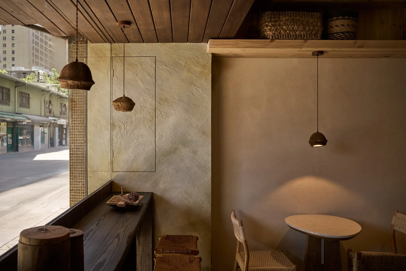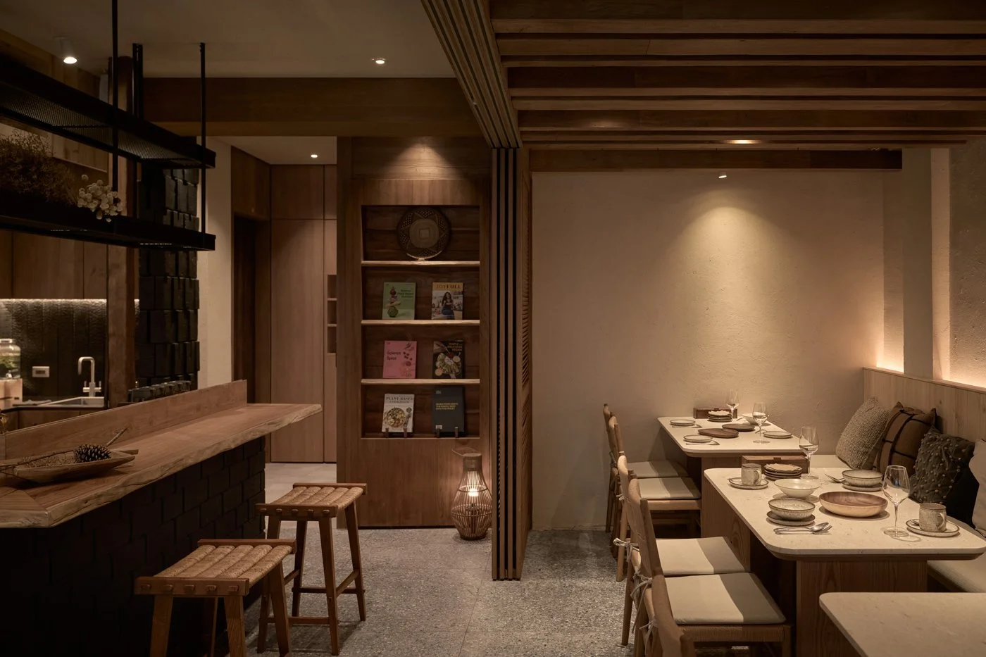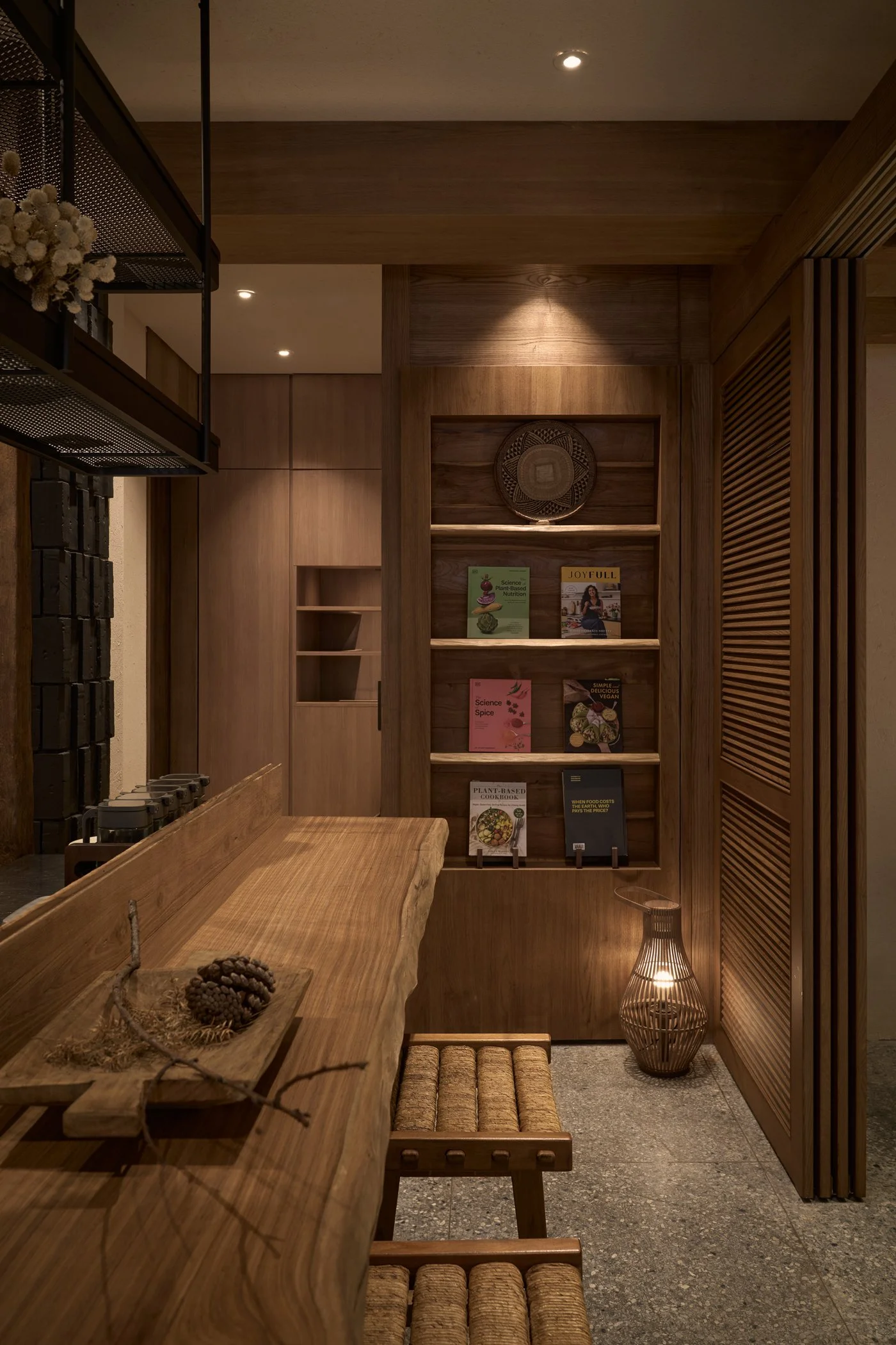 設計核心「身土不二」的精神,被設計團隊細膩地轉譯為可觸及的空間語言。他們從與自然互動的深刻記憶中擷取意象:想像陽光穿過層疊枝葉縫隙,在地面篩落細碎而溫柔光影。這段記憶也具象化為天花的木條設計,一道道排列彷彿天然的樹冠,既柔和了直射光線,也巧妙隱藏現代設備的痕跡。置身其中,即刻被靜謐氛圍包裹,呼吸隨之放緩,感官也如冬眠後被重新喚醒。