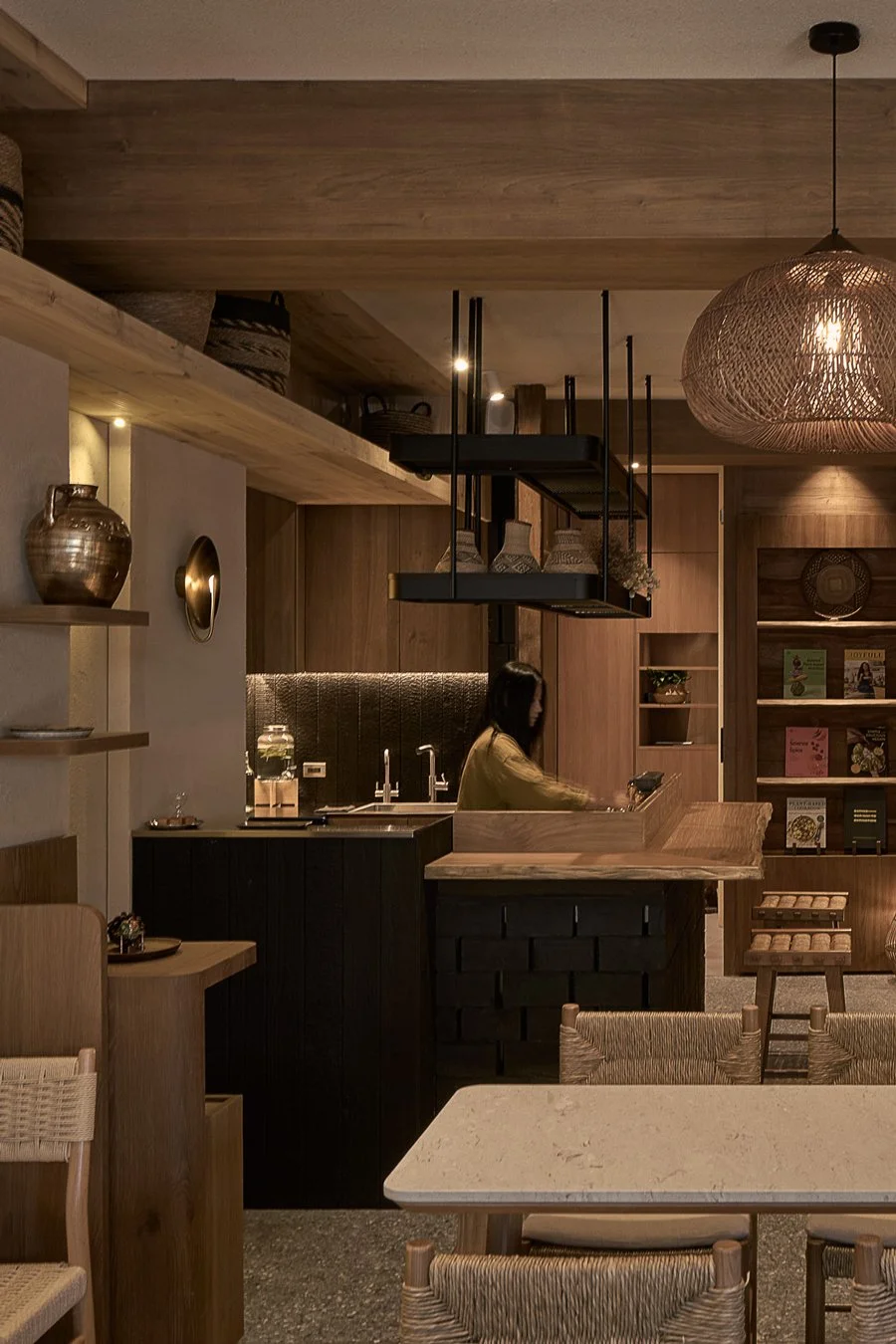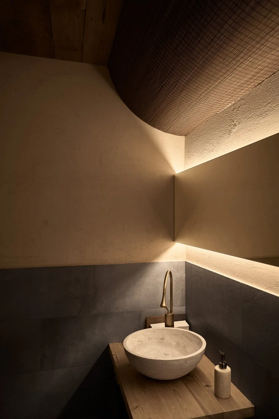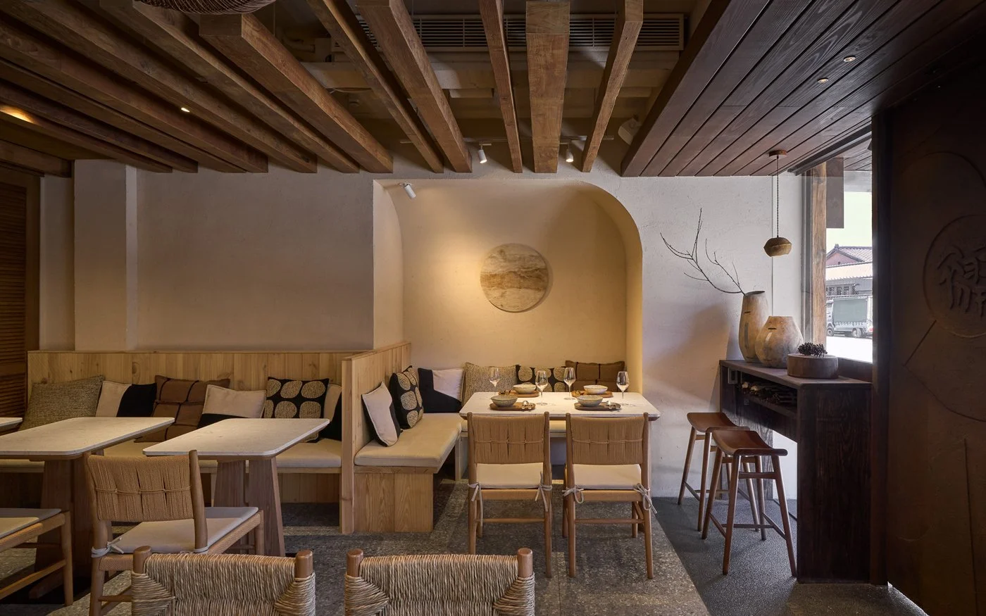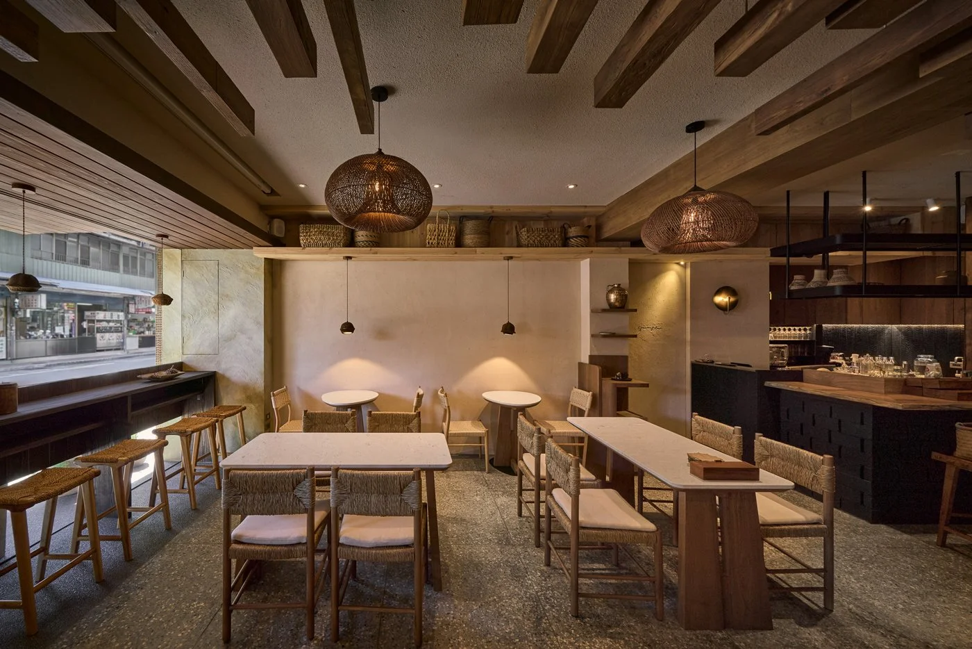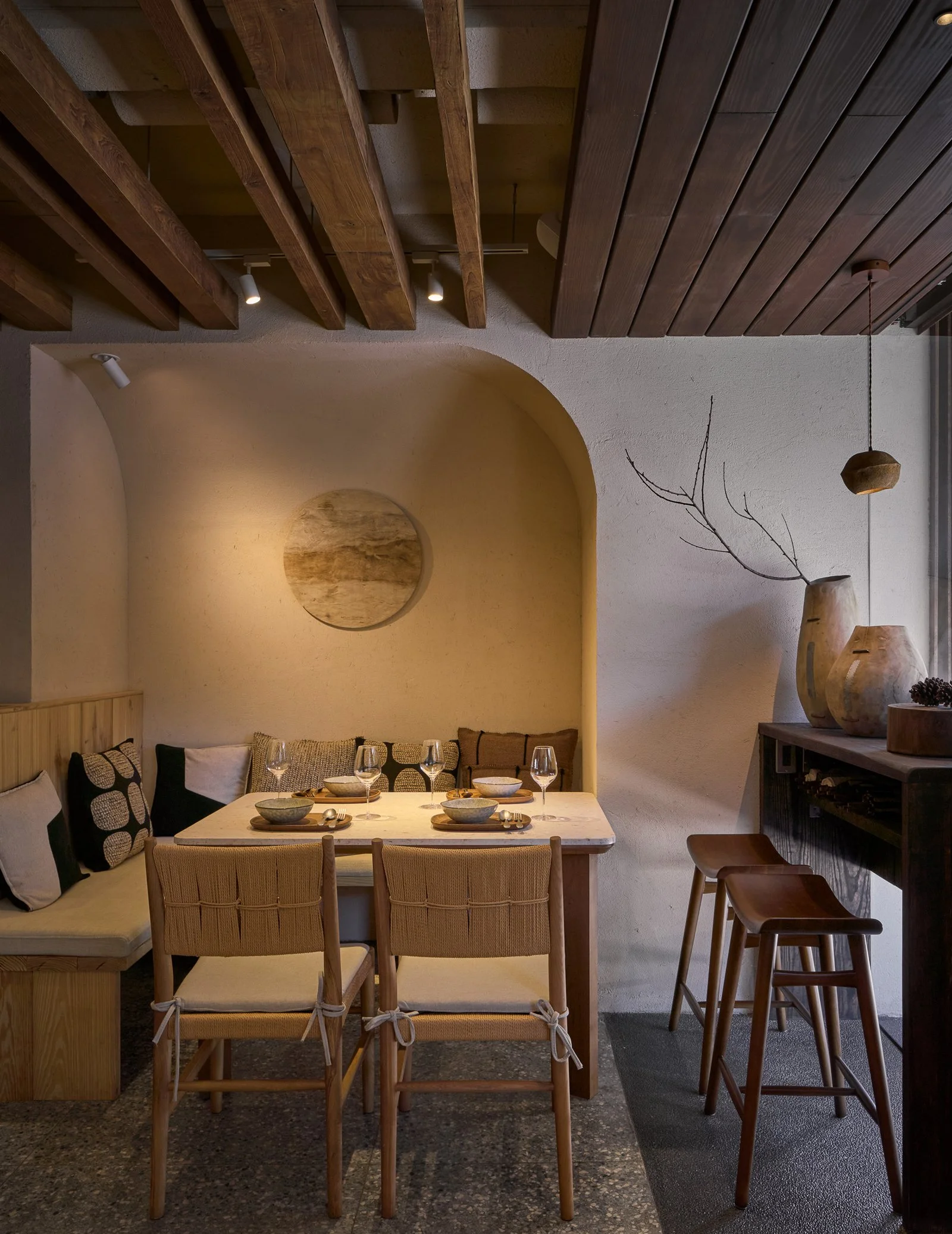 設計核心「身土不二」的精神,被設計團隊細膩地轉譯為可觸及的空間語言。他們從與自然互動的深刻記憶中擷取意象:想像陽光穿過層疊枝葉縫隙,在地面篩落細碎而溫柔光影。這段記憶也具象化為天花的木條設計,一道道排列彷彿天然的樹冠,既柔和了直射光線,也巧妙隱藏現代設備的痕跡。置身其中,即刻被靜謐氛圍包裹,呼吸隨之放緩,感官也如冬眠後被重新喚醒。