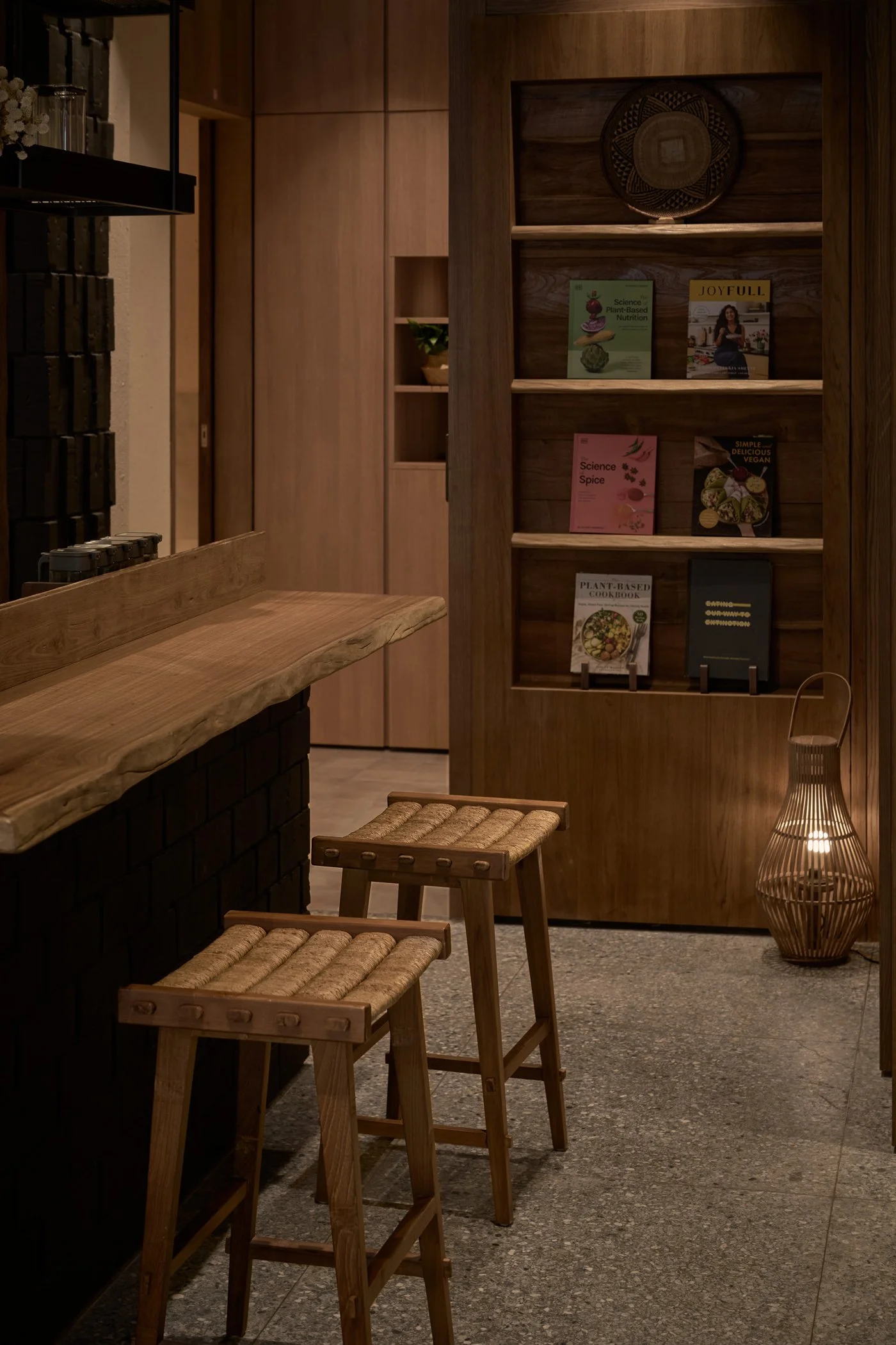 • Material choices follow the same philosophy of “whole foods,” where just as ingredients retain their natural character, the space preserves the raw qualities of its materials. Solid wood, red brick, and terrazzo are used throughout, with imperfections and patina intentionally left visible. Brick walls are laid in varied patterns as a nod to tradition while introducing new expressions of texture. The existing terrazzo floor has been restored and paired with black pebble pathways to create a seamless link between interior and exterior. Walls are finished with a mix of straw and rammed earth, allowing the space to quite literally breathe. Together, these material layers create a balance that feels both rugged and refined, rooted in heritage yet open to contemporary life.