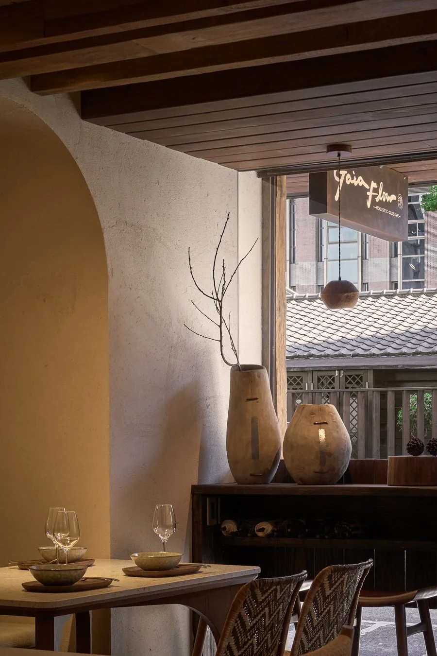 This pursuit of a sense of place lies at the heart of Gaia Flow, a plant-based restaurant designed by Arch Park. The design is anchored in the principle of “body and land as one,” where life and earth are inseparable and interdependent. For the founders, cuisine traces a complete trajectory from soil to table. Vegetables arrive with the imprint of the fields, are carefully transformed in the kitchen, and reemerge at the table as expressions of respect. The kitchen, therefore, occupies the very core of the restaurant, taking up nearly half of the floor area. It functions as the heart of the space, propelling its energy while making a quiet declaration: at Gaia Flow, the richness of the land and the value of food are given equal weight.
